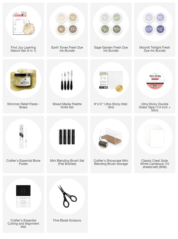 The floral frame in the Find Joy Layering Stencil set lends itself to repetition. So, I am using the frame to create sort of block formation on the papers using tones of ink from Earth Tones Fresh Dye Ink, Sage Garden Fresh Dye Ink set, Moonlit Twilight Fresh Dye Ink Set.