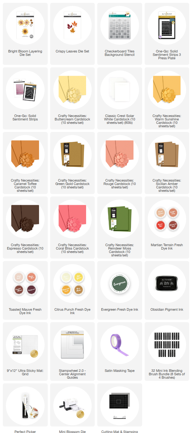 Hello crafty friends! It's Nathalie with you to share a new idea on how to bring a romantic autumnal feel to your projects featuring some of Altenew's latest released products. Today, we are going to focus on the Bright Bloom Layering Die Set, Crispy Leaves Die Set and Checkerboard Tiles Background Stencil to help us create this layout. Let's take a look at the project: