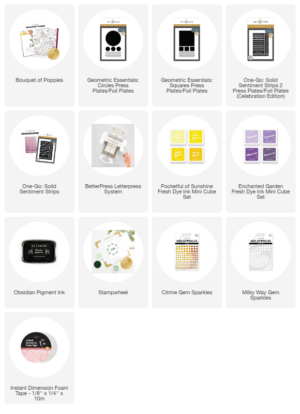 To create the backgrounds on today's cards, I used the Geometric Essentials: Circles Press Plates as well as the Geometric Essentials: Squares Press Plates. I paired it with florals from the stunning Bouquet of poppies stamp set.