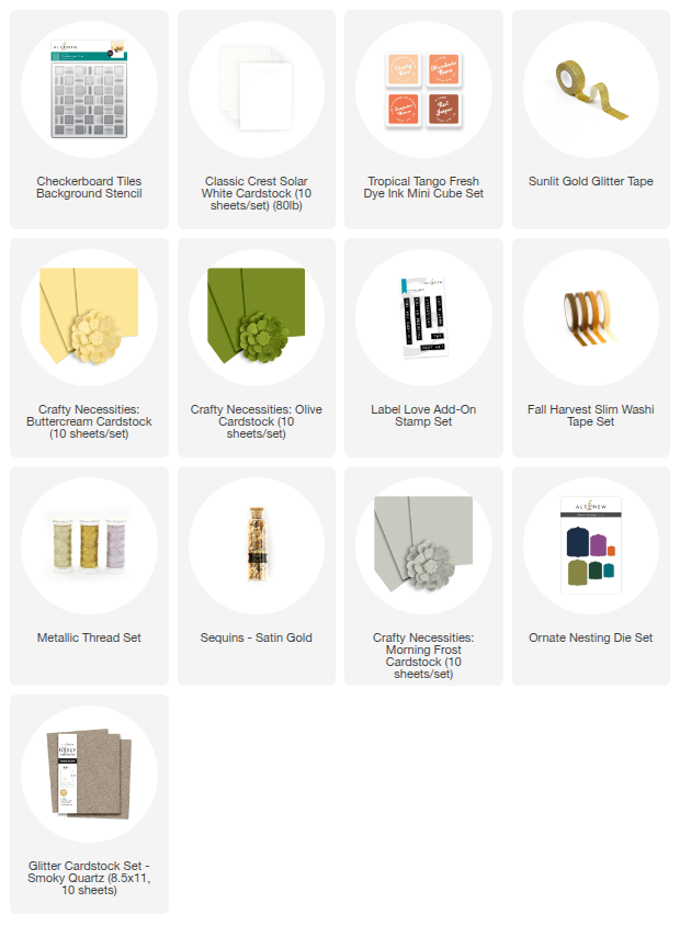 Checkerboard Tiles Background Stencil, Sunlit Gold Glitter Tape, and Label Love Add-On Stamp Set.