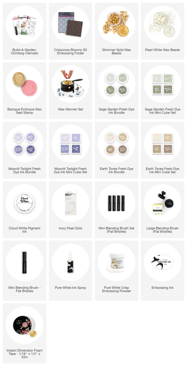 For the focal point of my shabby chic card, I used the Build-A-Garden: Climbing Clematis Bundle. I went with purple flowers and brown leaves, using the Moonlit Twilight and Earth Tones Fresh Dye Ink Bundles for my coloring.