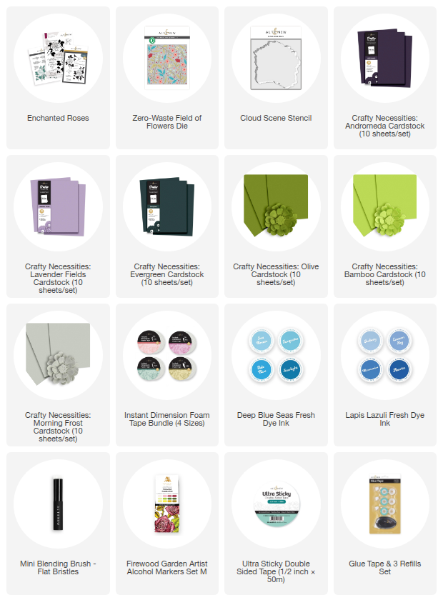 Shop the supplies used to make this card: Majestic Maple Tree Layering Die Set, Enchanted Rose Bundle, Zero-Waste: Field of Flowers, Fireside Escape Die Set, Cloud Scene Stencil Cardstock: Bamboo, Olive, Evergreen, Andromeda, Lavender Fields, Ink: Sea Breeze.