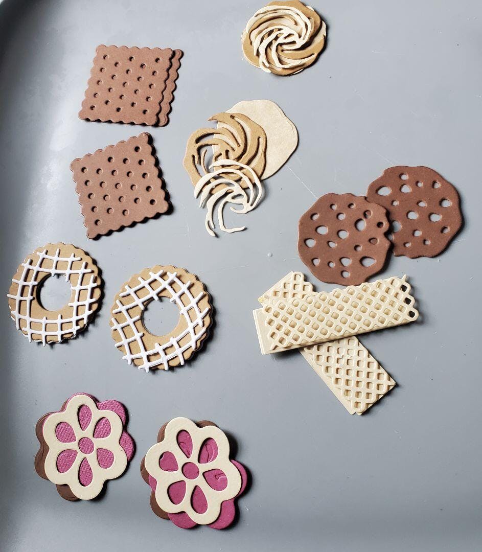 Die Dimensions: Chocolate Chips Cookie: 1.50" x 1.50" ▪ Round Butter Cookie: 1.34" x 1.31" ▪ Wafer Cookie: 0.70" x 2.10" ▪ Jam-filled Cookie: 1.50" x 1.30" ▪ Cracker: 1.40" x 1.40" ▪ Round Sugar Cookie with Frosting: 1.60" x 1.60"