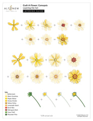 The Craft-A-Flower: Coreopsis Layering Die Set brings vibrant Coreopsis blooms to life with two flowers, each featuring four detailed layers and centerpieces. Skip Layer 4 for a varied look, and use the included large stem with the smaller flower and a bud to complete your design. Perfect for adding dynamic, layered beauty to your paper crafting projects!