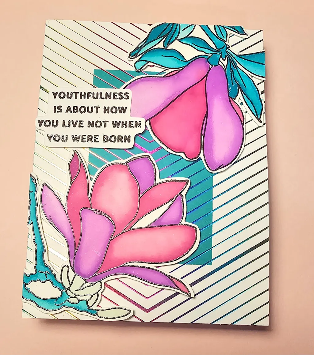 The simple coloring stencil set allows you to effortlessly add color to the tulip magnolia flowers and leaves. Simply align each stencil with the outline image and use a blending brush to blend in your favorite ink colors. There are two stencils in this set. Use the add-on coordinating die to add dimension.