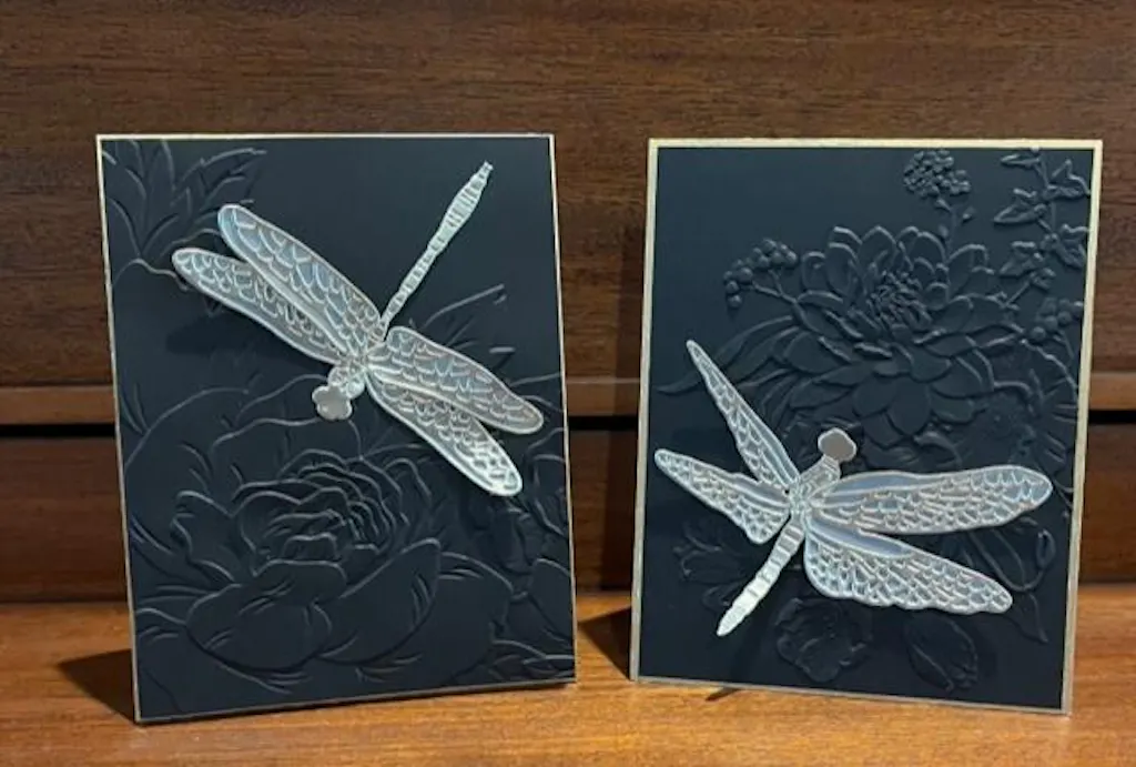 This die set creates 2 gorgeous dragonflies that are large and detailed. It's hard to tell in the photos, but the bodies of the dragonflies have etched markings that are so pretty and realistic up close. I paired the gold and vellum die cut dragonflies with black backgrounds I had embossed with florals to create the sympathy cards in the photos below.