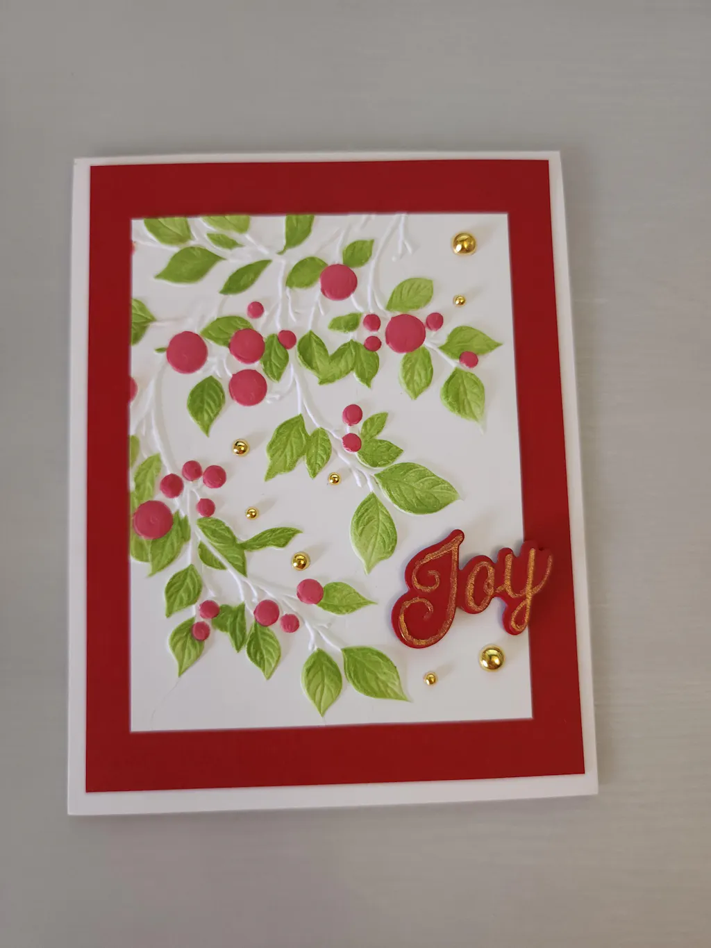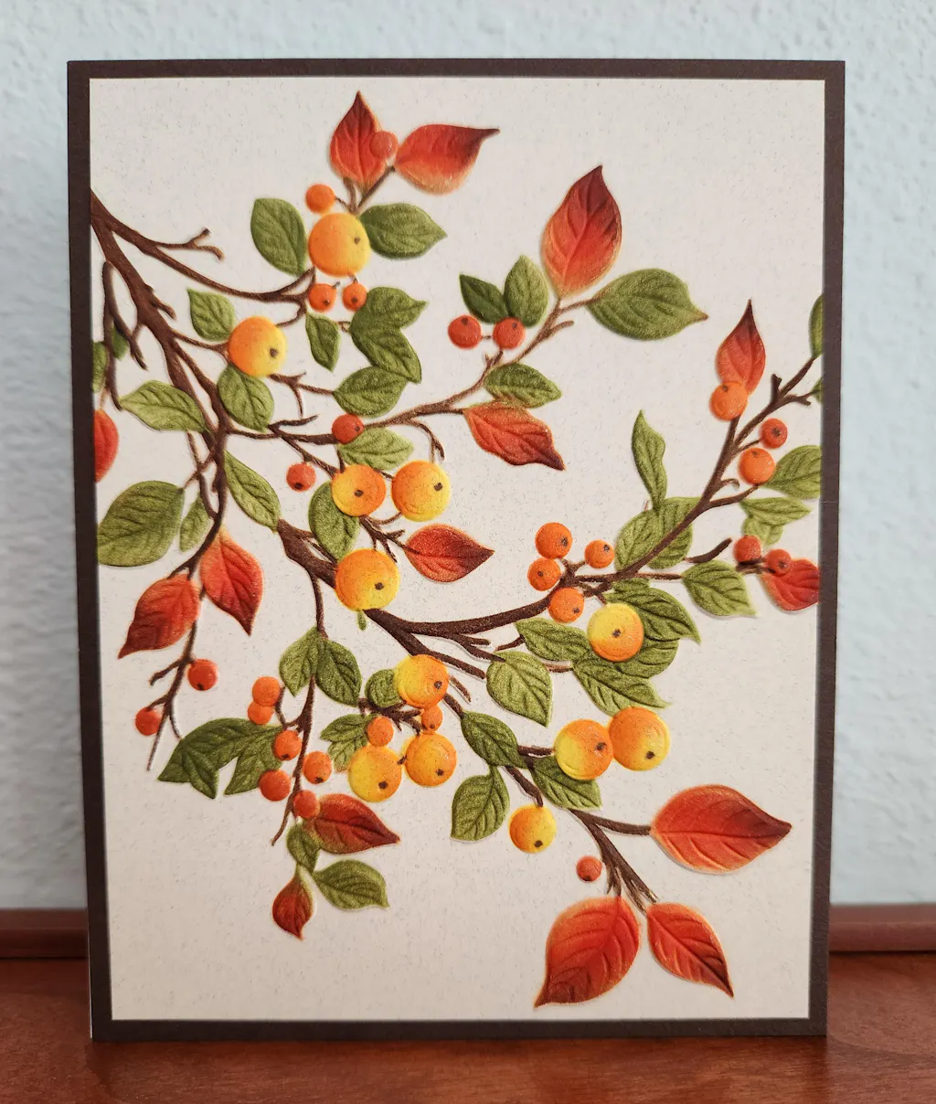 The Lush Berry Branch stencils align perfectly with the embossing folder impression. It was quick and fun to make some gorgeous cards using autumn themed colors. Just by changing the color palette, these products can be used year round.