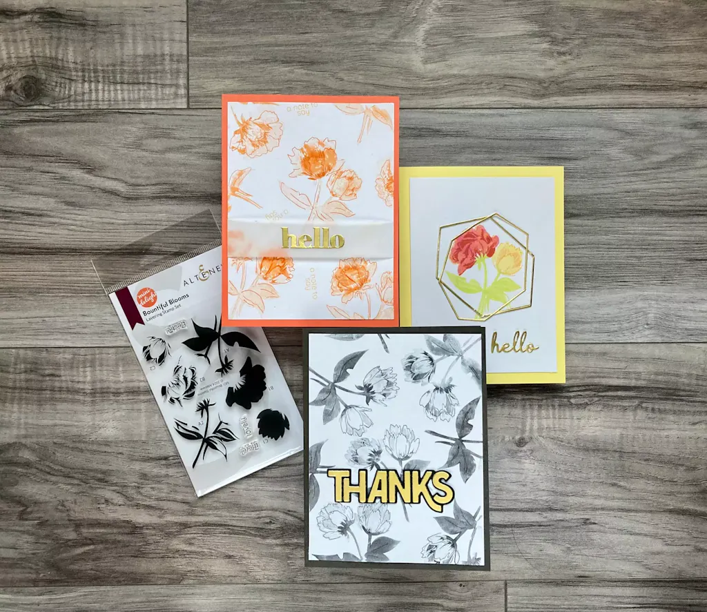 I got this to practice a few techniques and loved it! It makes a great companion for an old time favorite of mine : Peony Bouquet, and goes well with different size sentiments. These mini sets are great for backgrounds, smaller note cards or gift tags! 🤩