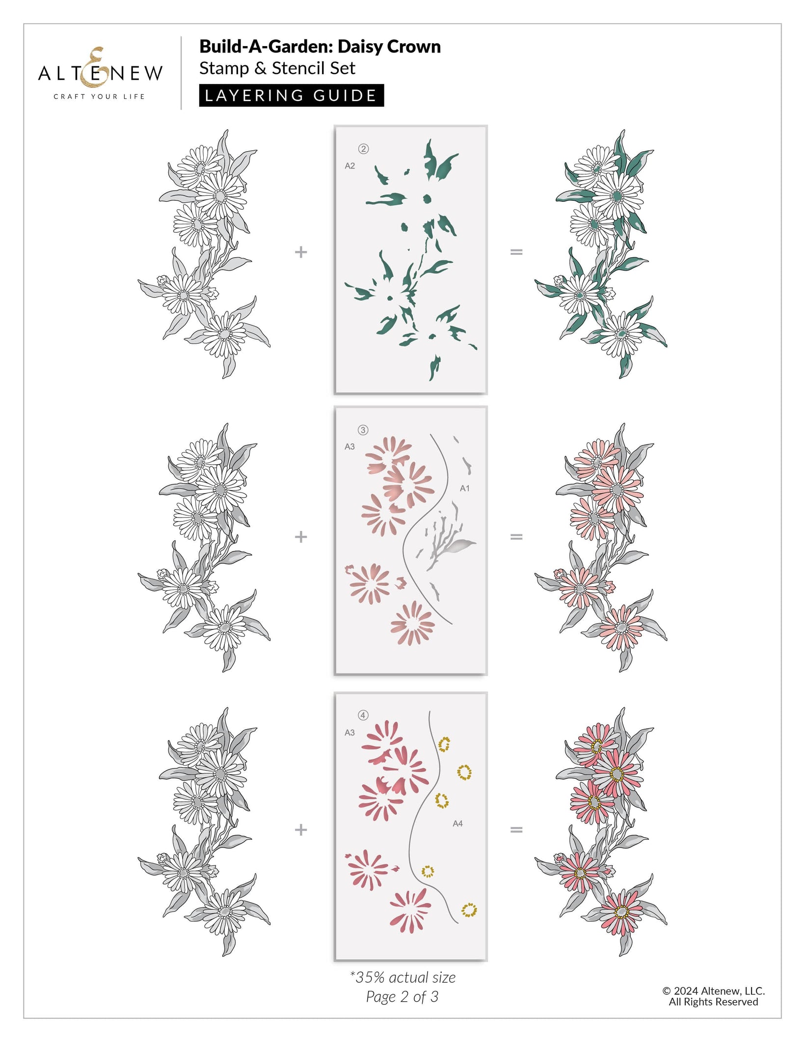 The Build-A-Garden: Daisy Crown Layering Stencils are sized uniquely at 4.5" x 8" - designed explicitly for the tall floral clusters in the Daisy Crown Stamp Set. They will help you create gorgeous leaves in one go. Simply align each stencil with the image and blend in your favorite ink colors!