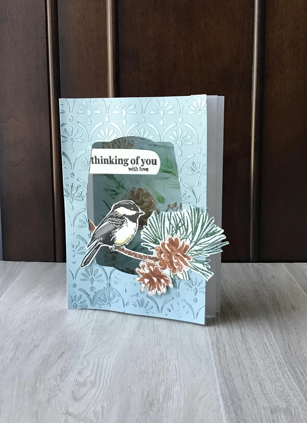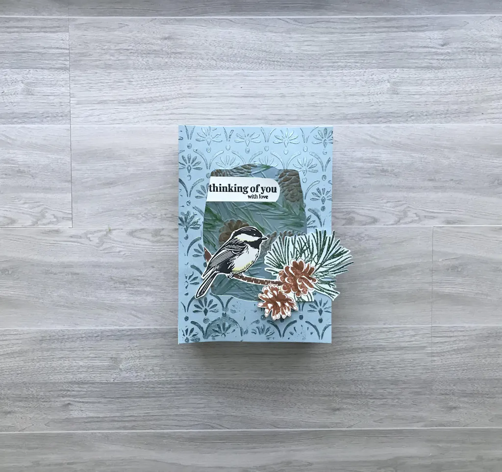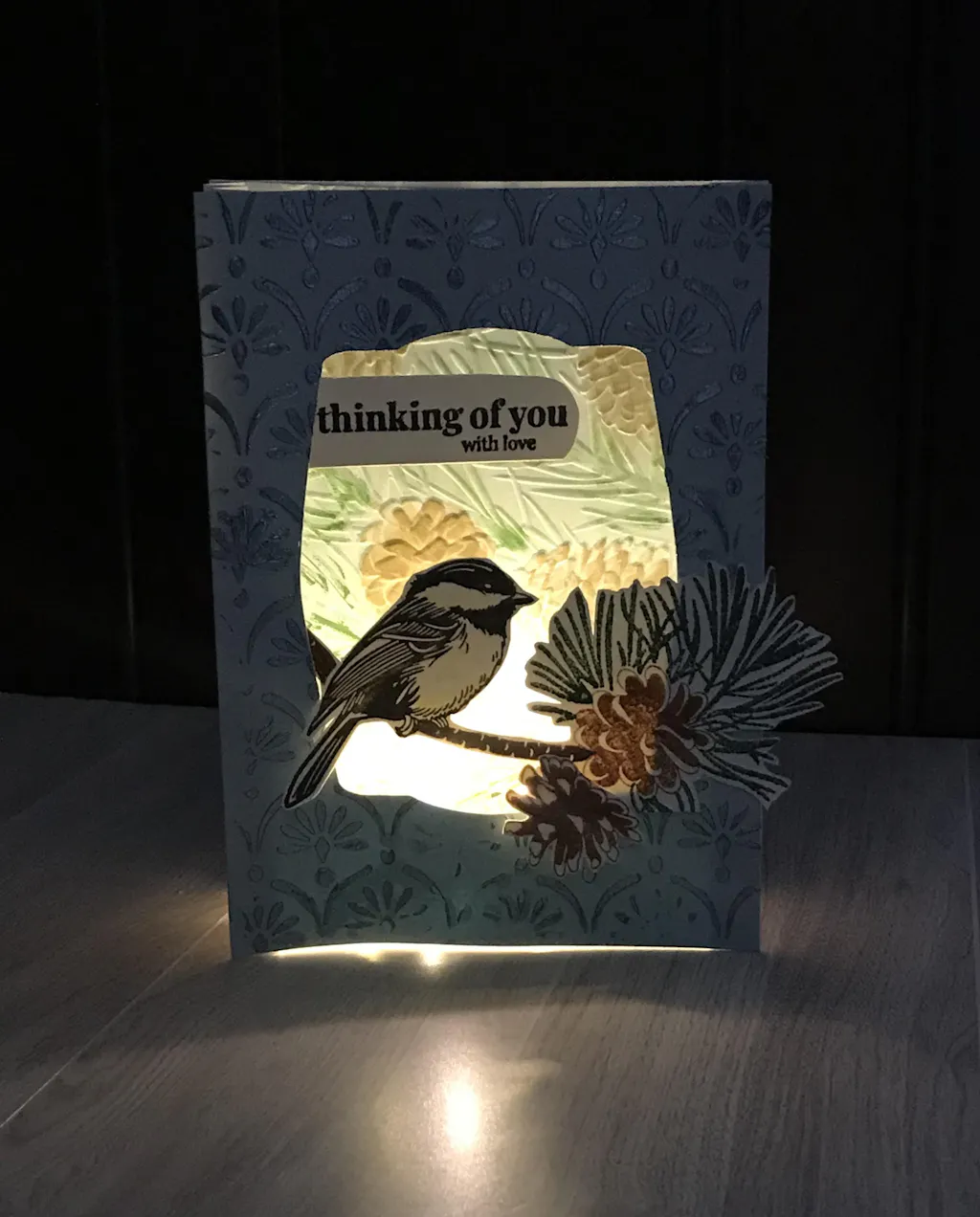 This chickadee is absolutely adorable, so easy to align with the registration template! A great size for large format cards, here is on a 5 x 7 in shadow box /luminary.