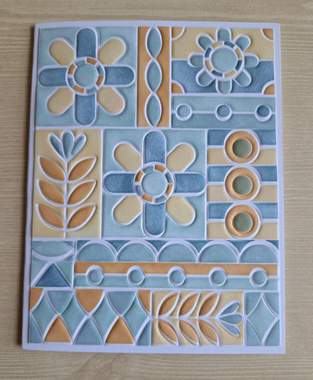 • If using the coordinating hot foil plate isn't your preference, you have the option to utilize the uncomplicated coloring stencil set independently. This set includes etching lines that aid in aligning the elements seamlessly, resulting in a cohesive mosaic image.