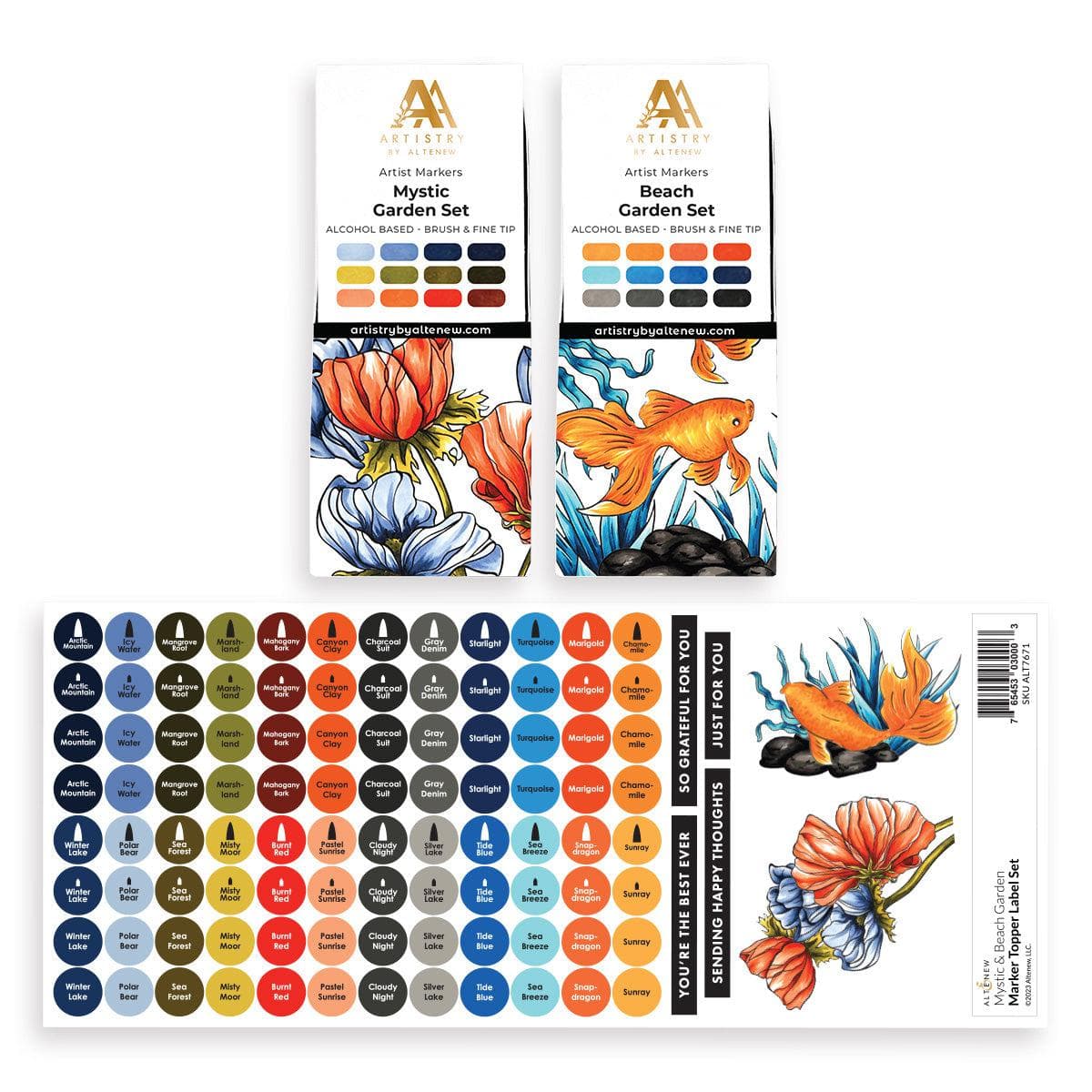 This is a bundle of Mystic Garden Artist Alcohol Markers Set J, Beach Garden Artist Alcohol Markers Set K, and Mystic & Beach Garden Marker Topper Label Set.