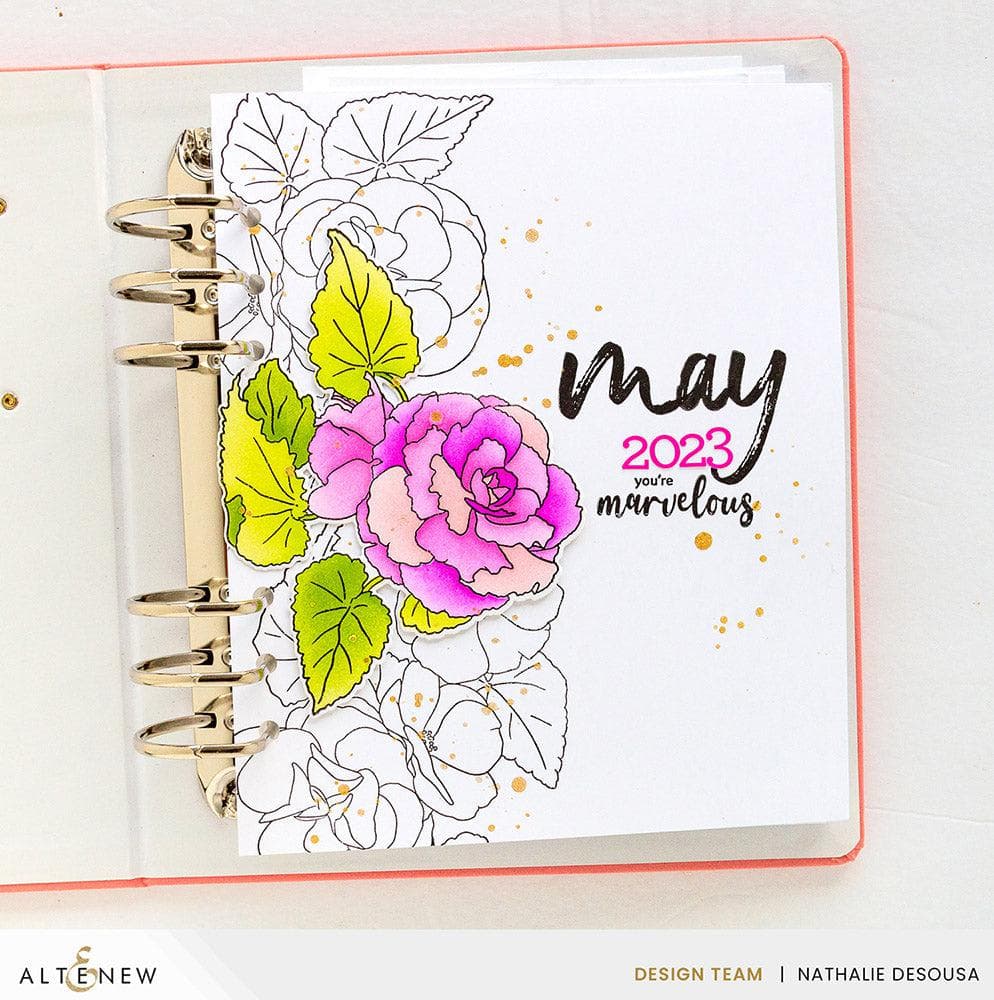 The simple coloring stencil set allows you to effortlessly add color to the Frilly Begonia flowers and leaves. Simply align each stencil with the outline image and use a blending brush to blend in your favorite ink colors.