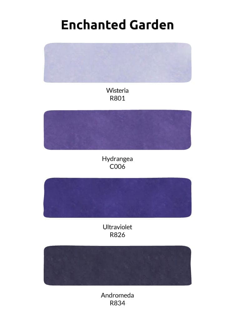 This bundle contains all four Alcohol Inks from the Enchanted Garden color family, Wisteria, Hydrangea, Ultraviolet, and Andromeda, at a specially discounted price.