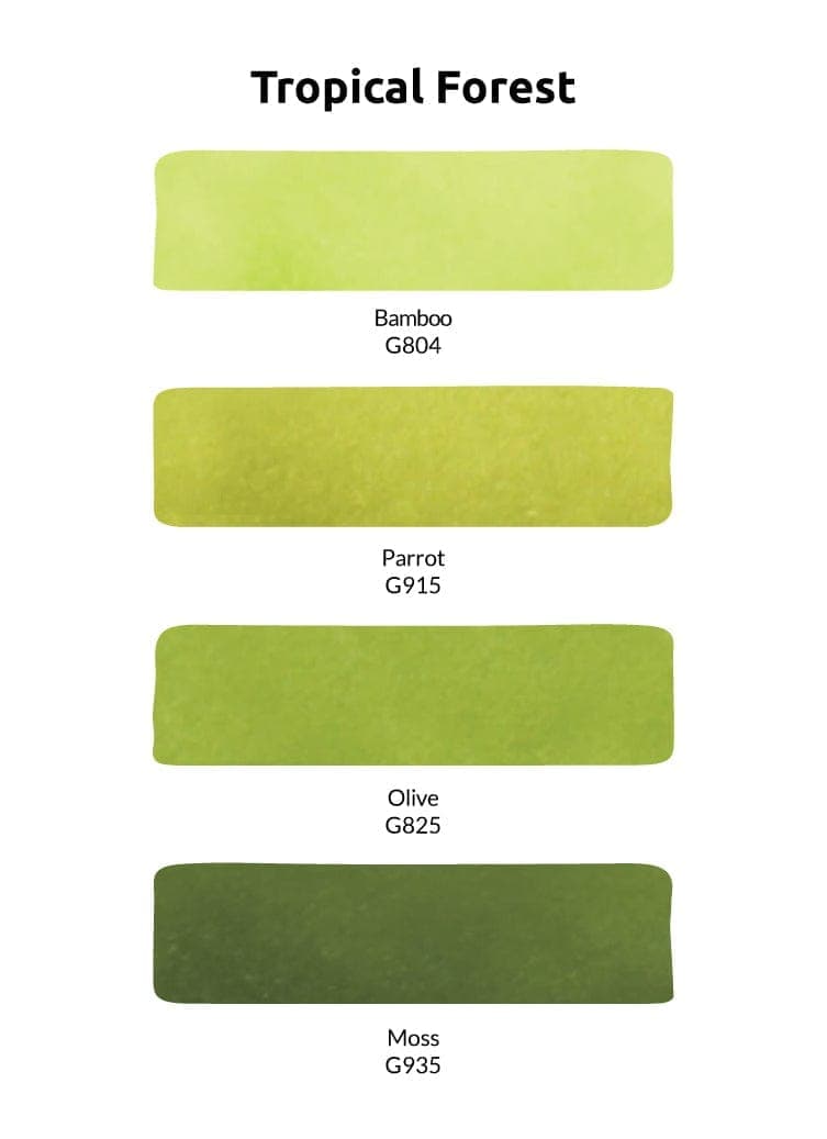 This bundle contains all four Alcohol Inks from the Tropical Forest color family, Bamboo, Parrot, Olive, and Moss, at a specially discounted price.