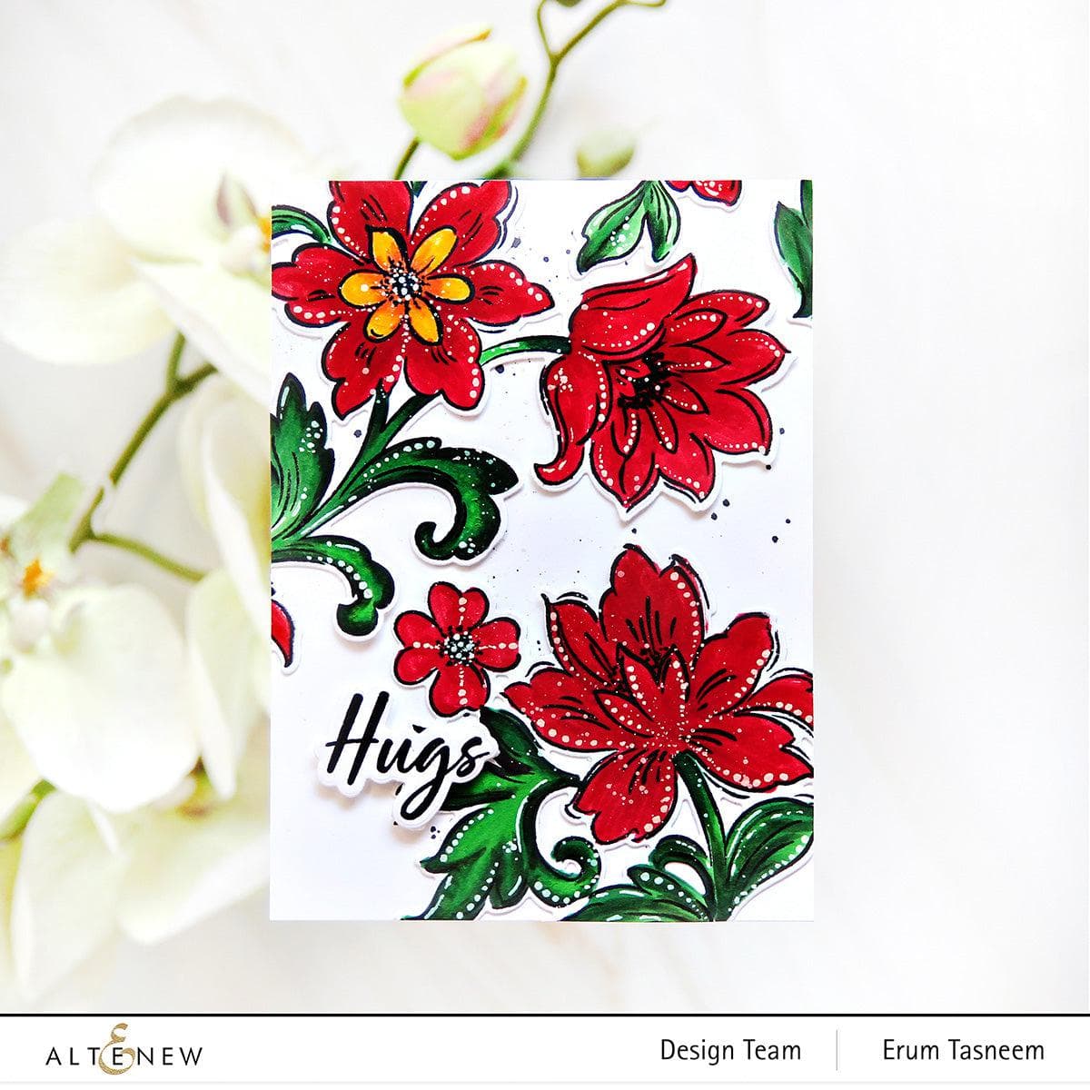 The kit includes a 6" x 6" embossing folder features one of the floral motifs from the stamp set, further enhanced by decorative swirls framing the motif.