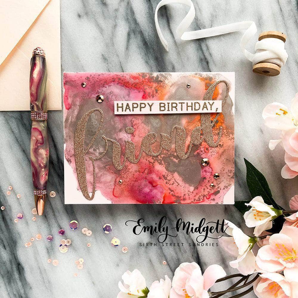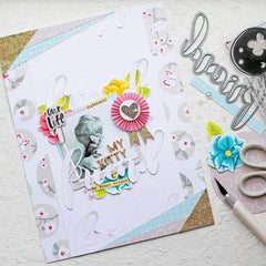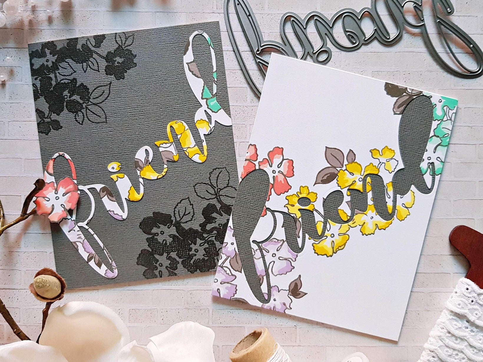 Making cards is not a new paper craft for me; however I am mostly a scrapbooking addict and this die is a great opportunity to enjoy both hobbies. The die is perfect for a title on any page, and while slightly large I was able to use it as a main feature in a card for a dear friend, by using it horizontally.
