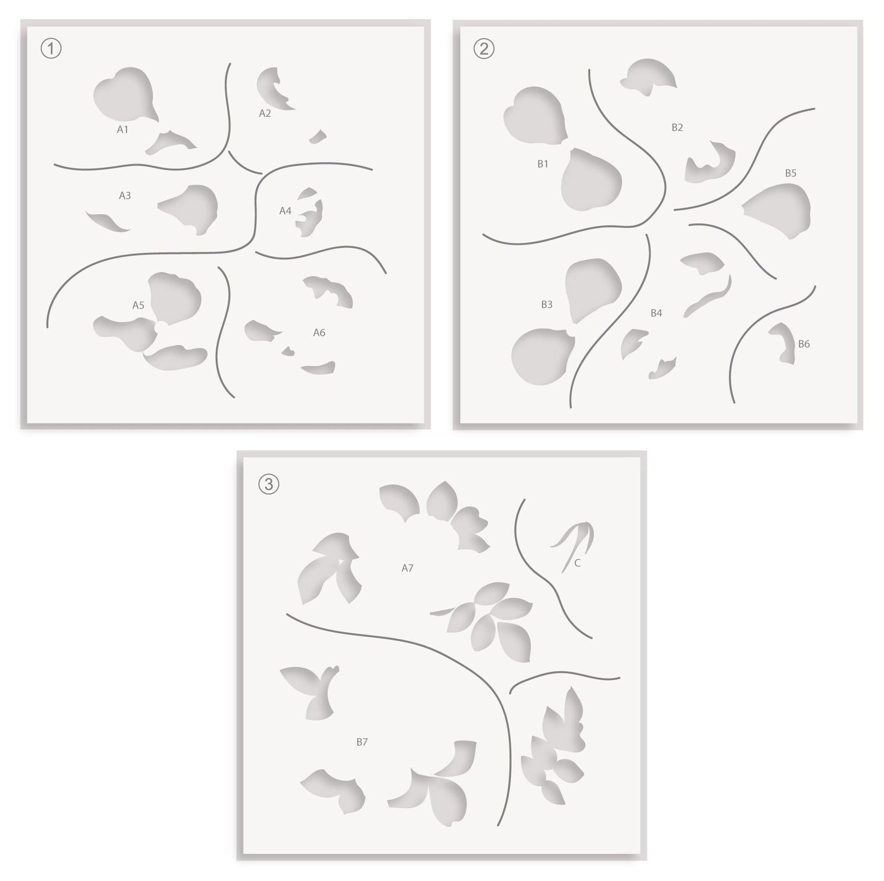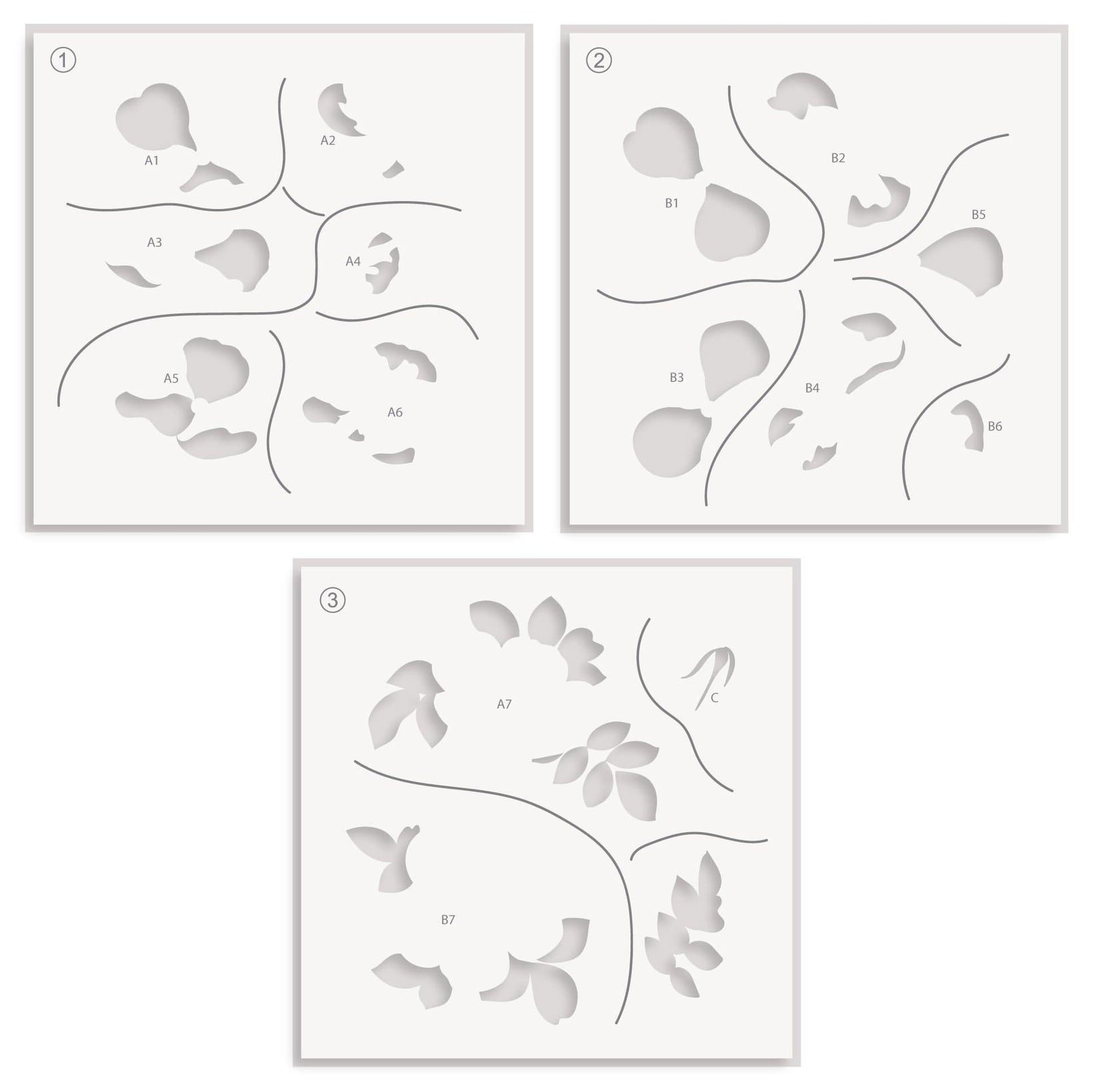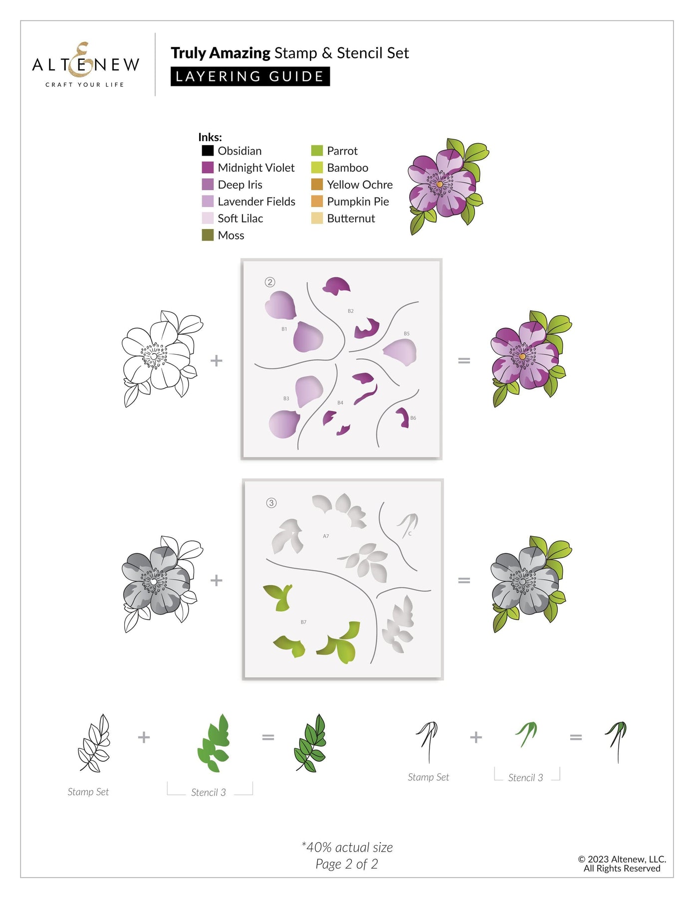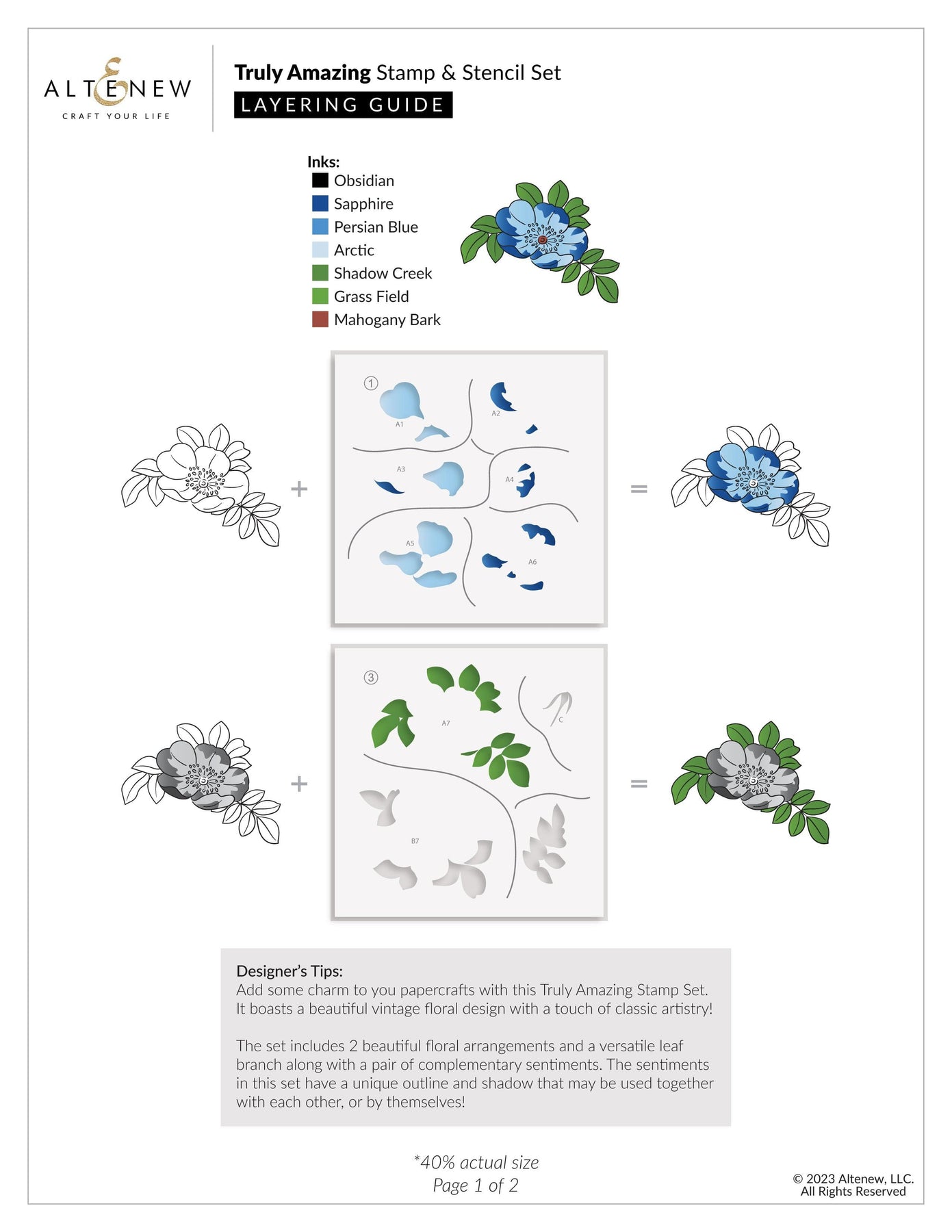The (3 in 1) Truly Amazing Layering Stencil Set coordinates with the Truly Amazing Stamp Set. The stencils can be used to add elegant layered coloring to the beautiful floral arrangements and leaves in the stamp set.