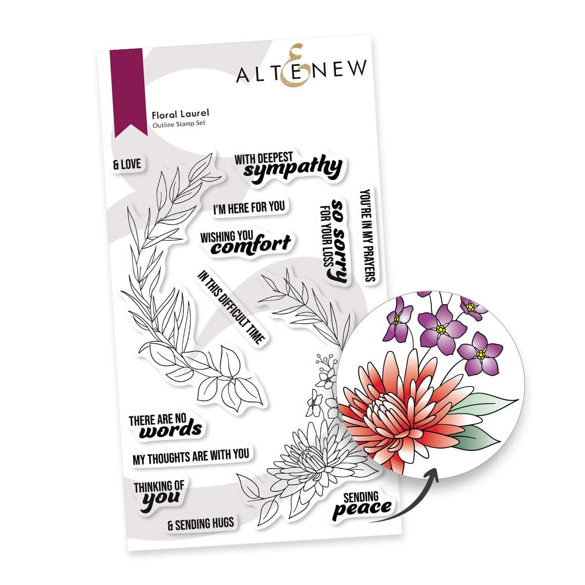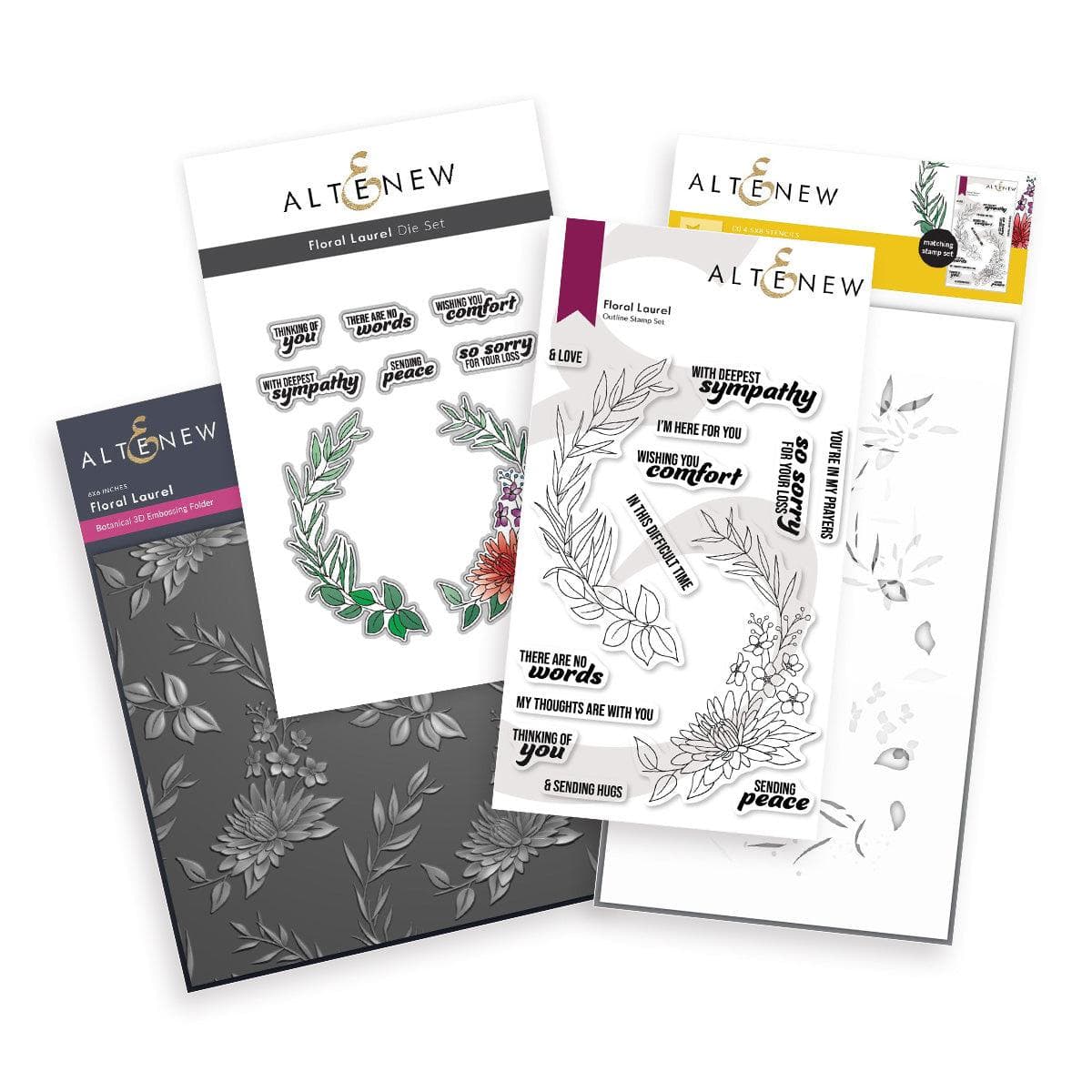 This is a special bundle of the Floral Laurel Stamp Set, Floral Laurel Die Set, Floral Laurel Simple Coloring Stencil Set, and Floral Laurel 3D Embossing Folder.