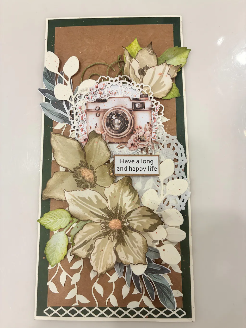I have been into making flowers with dimension lately and I wanted to try and make flatter flowers, so that mailing would not be a problem. I used Altenew's Climbing Clematis set with the earth tone ink colors .....beautiful earth tones for the flowers with green and off white leaves!