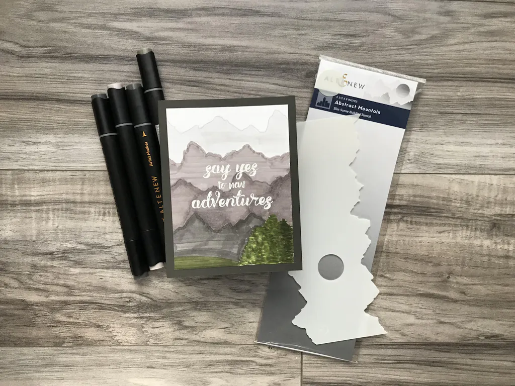 This stencil is a quick way to create mountain backgrounds. Even though it is intended to be used with inks, the possibilities are endless when it comes to coloring media. Here I used it with Altenew Alcohol Markers for a quick background.