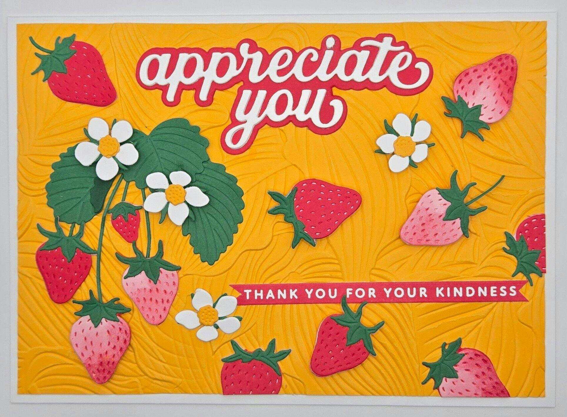This set is so well designed! I love that it creates a small hanging cluster of strawberries as well as a larger grouping of strawberries! It's also brilliant the way the dies are grouped so that you can cut all the strawberries at once, all the flowers at once, etc. because they are all together on their respective dies. That saves time and makes it easier to keep from losing tiny dies.