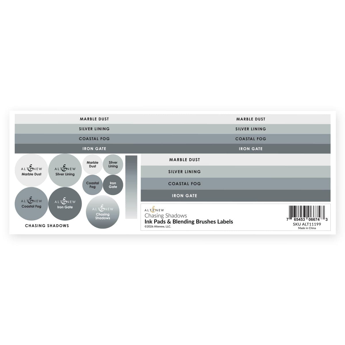 These labels are meant to be used with the Altenew Chasing Shadows Fresh Dye Ink color family. They are designed to perfectly wrap around your round ink pads and mini cubes, and right on top of your small and mini blending brushes. With these labels, you can easily identify which inks are which, even with the caps off, and which blending brushes are for specific shades. Plus, they're so pretty to look at!