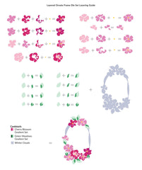 This die set includes a gorgeous silhouette frame created from an assembly of layering flowers and leaves intertwined with a wide ribbon. The wavy-edged flowers and the leaves can be brought to life with two colored layers, and the pointed-petal flowers with three layers.