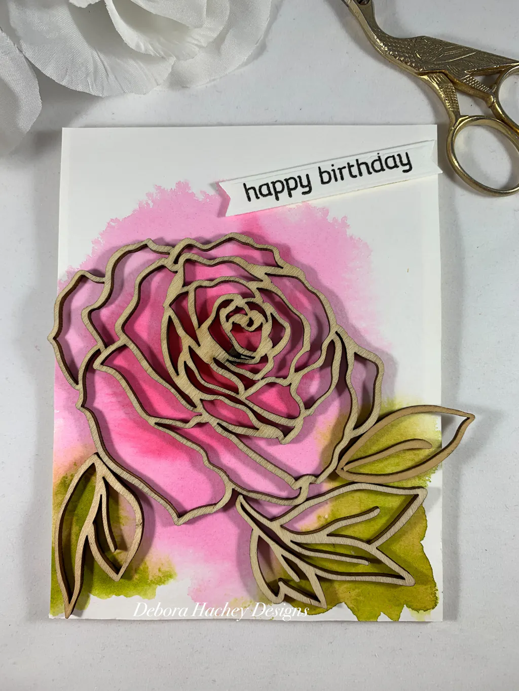 I really like this set of veneers; they are stronger than chipboard and more beautiful. I used the rose as an outline for a watercolor card.