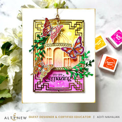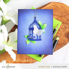 I had such fun making this card with the Altenew Bird cage (part of this set), Deco Cover die & Miss You dies!