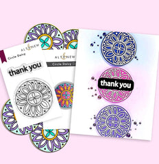 The 2" x 3" Circle Daisy Stamp Set showcases a circular floral mandala that may be stamped multiple times to create a variety of patterns or backgrounds. It also includes the versatile "Thank you" sentiment to help complete your projects.