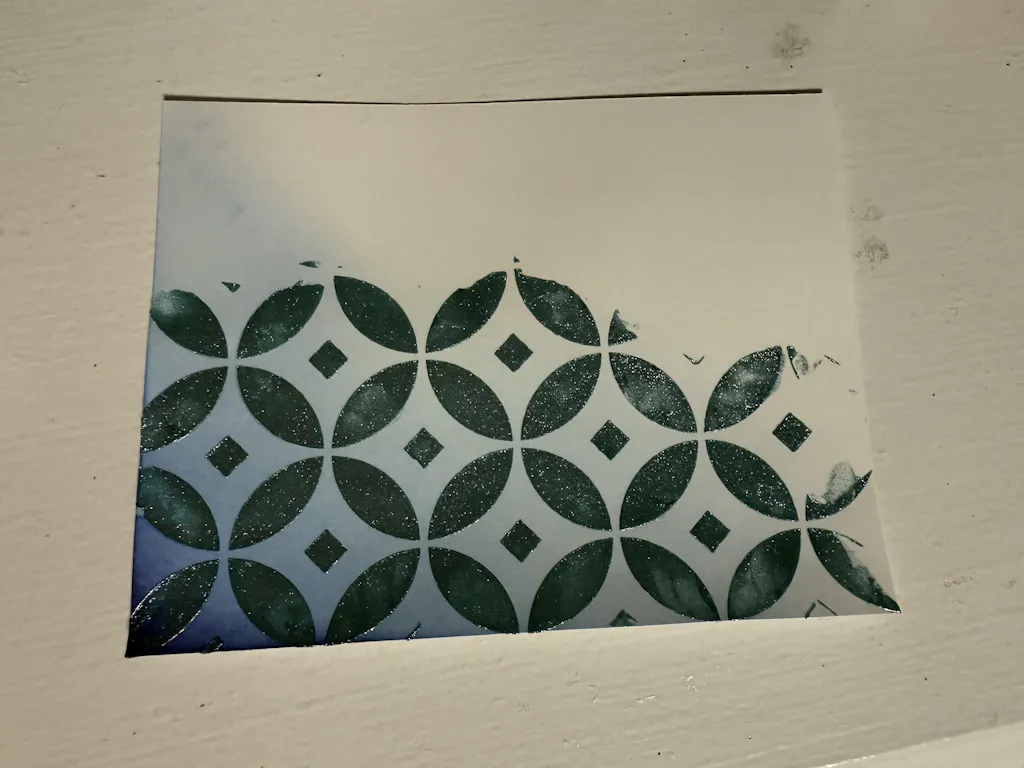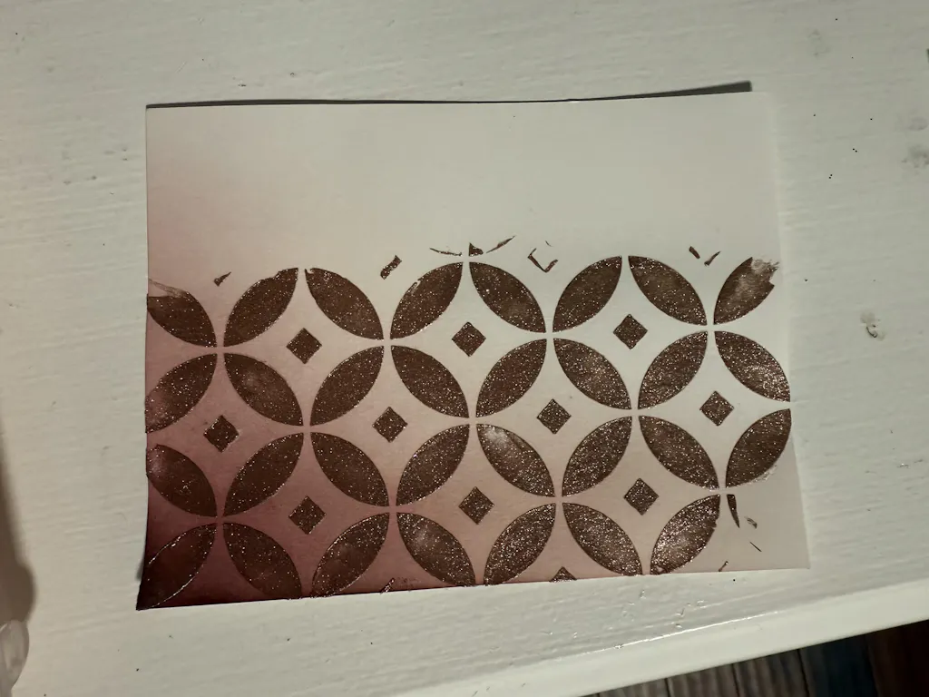 Place the stencil over the project area and secure it with washi tape, painter's tape, or any other repositionable adhesive. Add patterns to your project by blending inks, spraying mists, applying embossing paste, or adding glitter. Gently pull the stencil off from the project area to see the result.