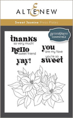 The Sweet Jasmine Press Press Plates/Foil Plates honors the jasmine with a cluster of blooms, buds, and leaves. It includes five sentiments in a modern font pairing that perfectly complement the arrangement.