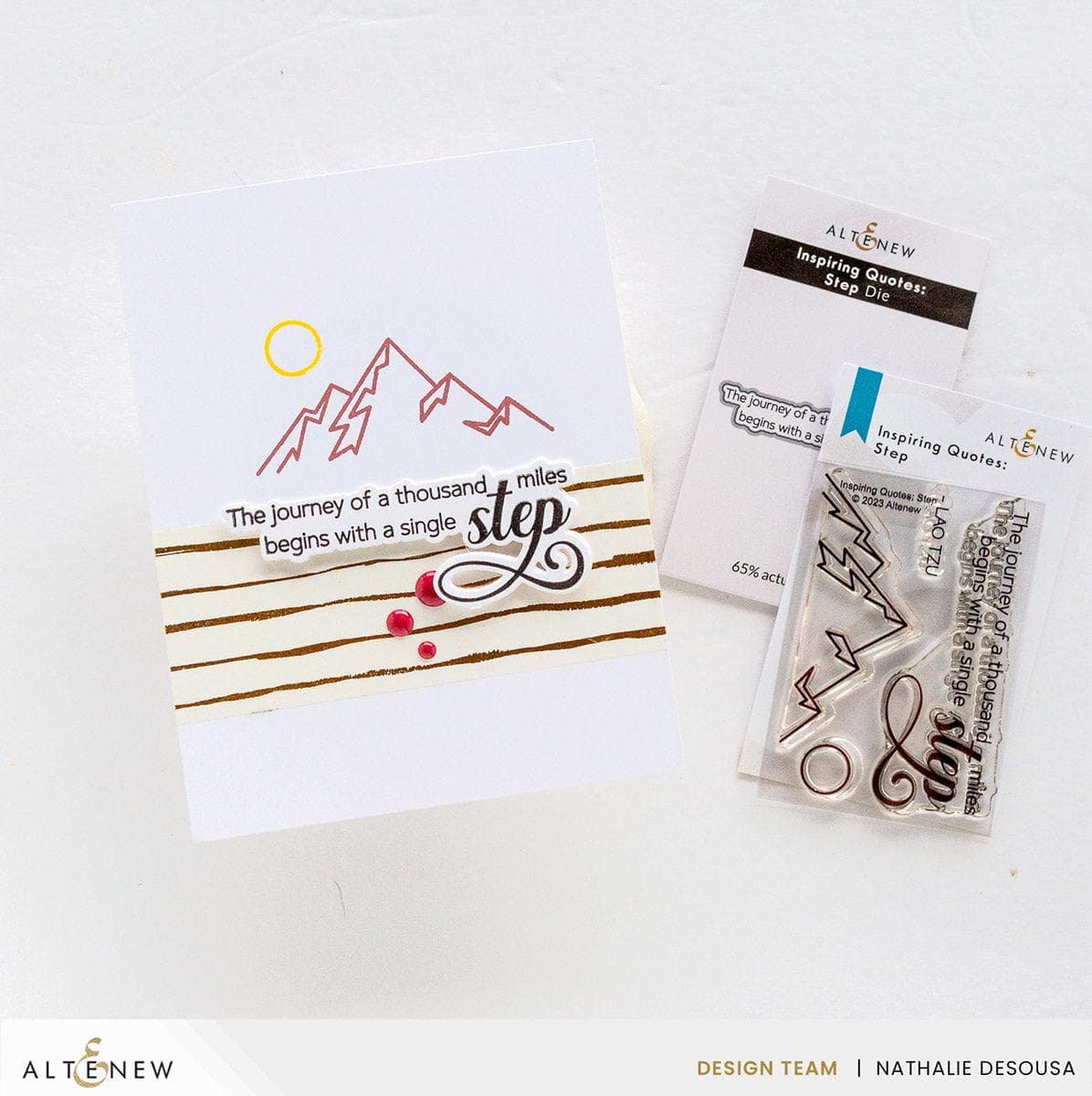 The 2" x 3" Inspiring Quotes - Step Stamp Set was inspired by the popular quote, 'The journey of a thousand miles begins with a single step' by Lao Tzu. It features a mountain and a sun/moon, adding symbolic depth to your project. There are 4 stamps in this set.