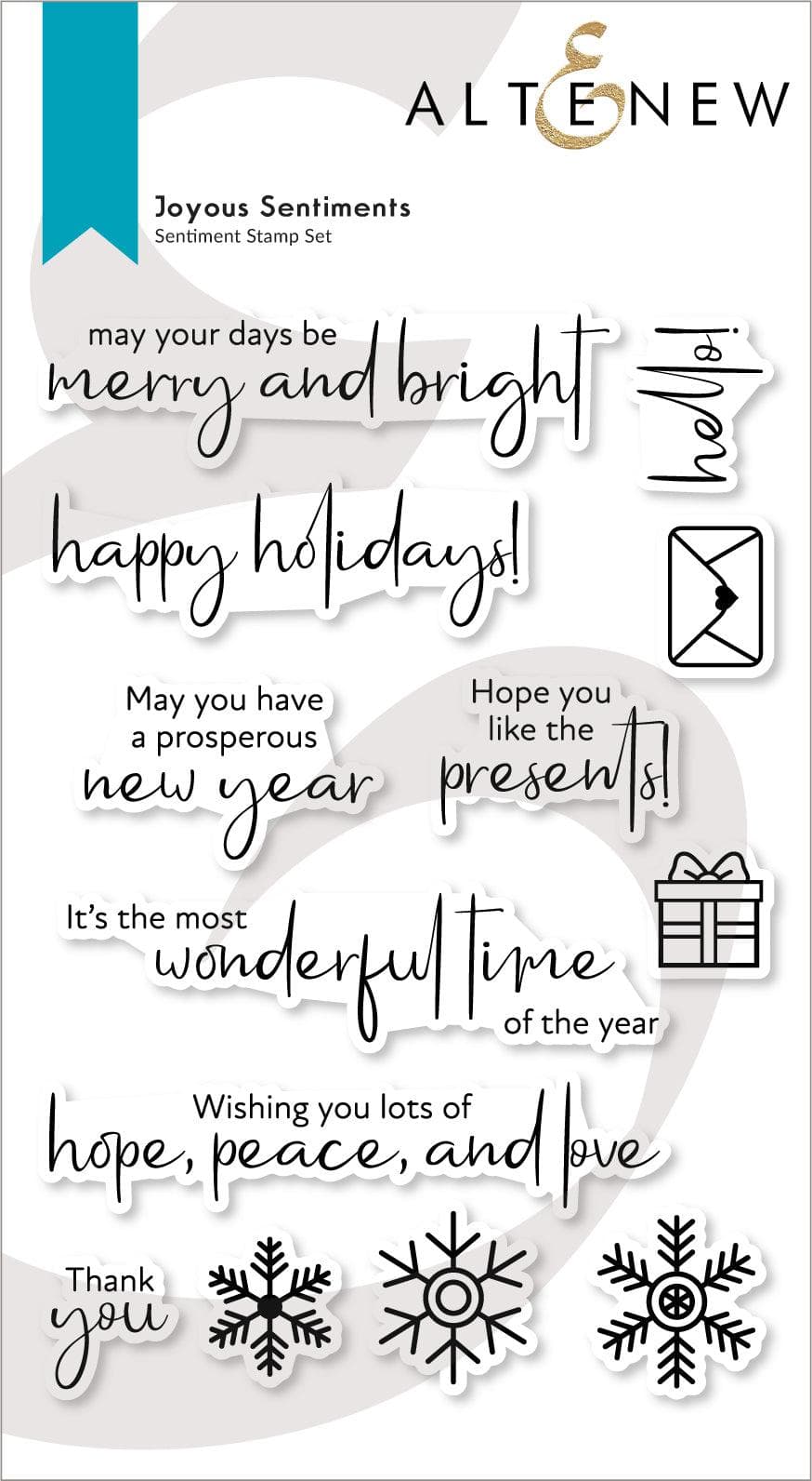 The 4" x 6" Joyous Sentiments Stamp Set is perfect for your holiday-themed cards or art projects! It features sweet and festive sentiments that you can center on your card, along with three snowflakes, a little gift, and an envelope. Share some holiday cheer with those you love through this wonderful stamp set! There are 13 stamps in this set.