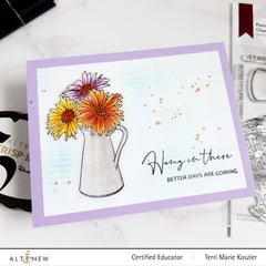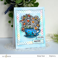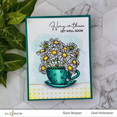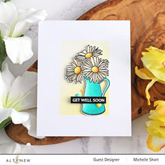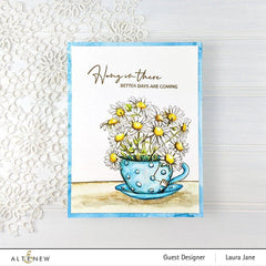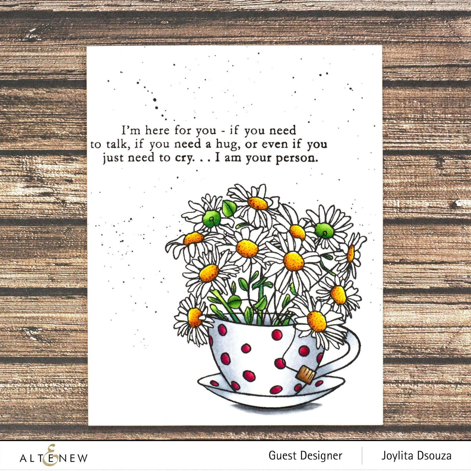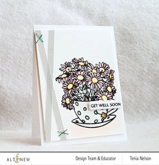 The outline stamp set has been designed with a little whimsy and a lot of imagination. It features a charming nod to actual chamomile tea with a cup and saucer, along with a more traditional bouquet arrangement in a vase. The sentiments in the set will help you send healing thoughts to your loved ones.