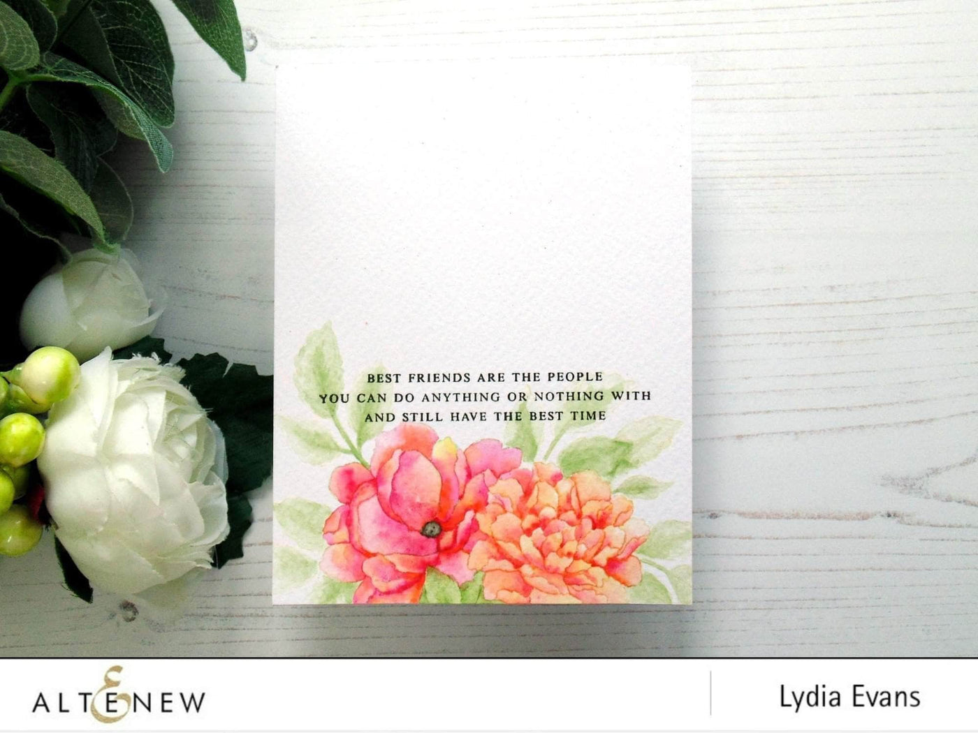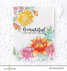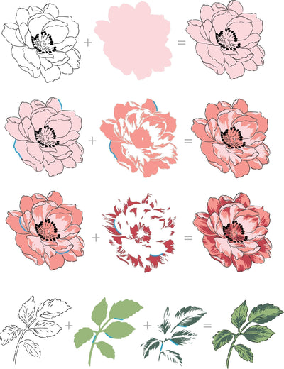 In style with our popular layering stamps, this set has a large 4-step peony. Additional supporting images include both multi-step and simple outline images. Notice that the central flower and the leaves can be stamped with or without the outline layer, and the outline image can be used independently if you prefer coloring or stamping as is. A few delicate clusters of mini flowers and leaves will make your project shine.