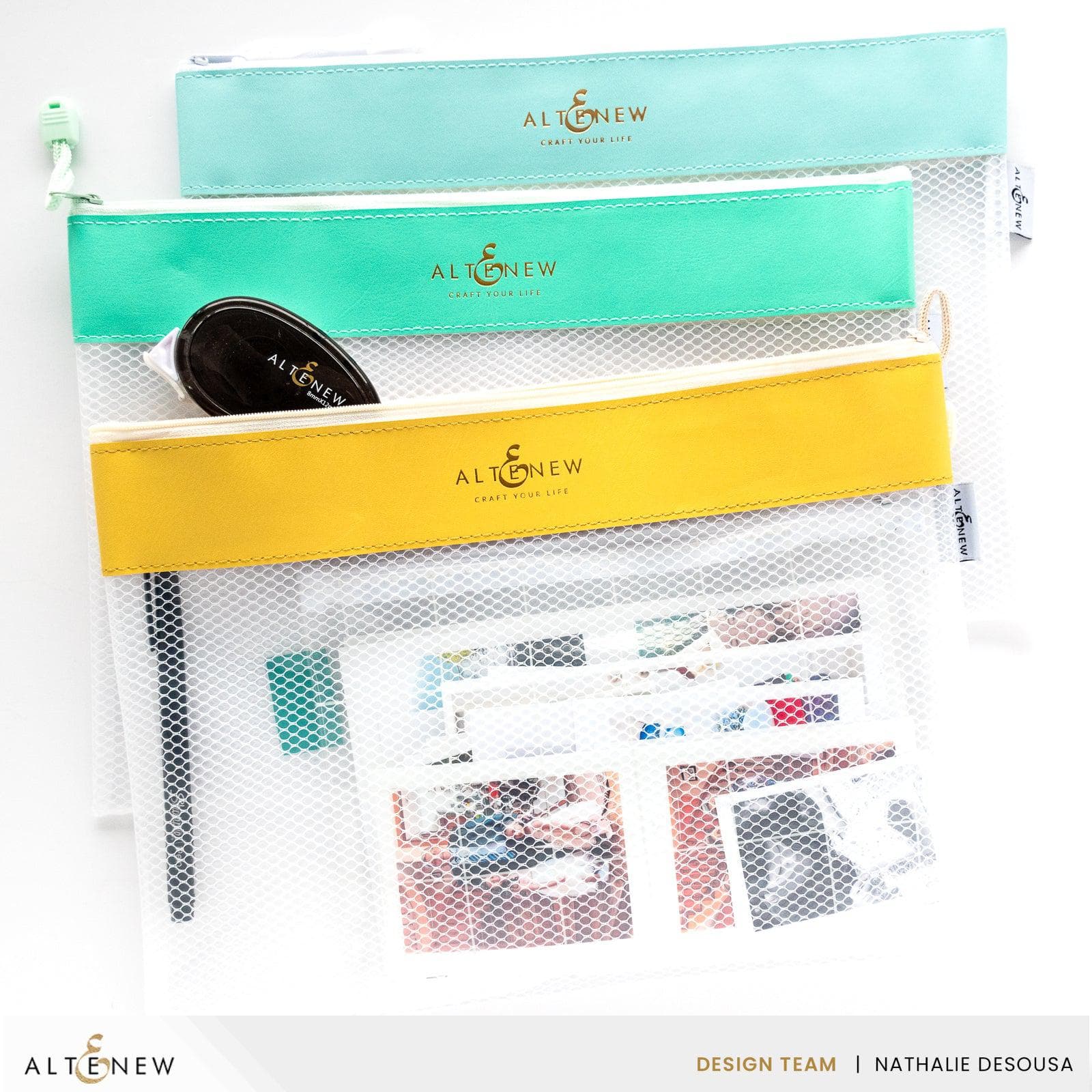 The Zip 'n' Stash mesh zipper pouch boasts a sturdy mesh encased in plastic, offering a glimpse of its contents. Each pouch features a gold foiled and embossed Altenew logo on a strip of colored vegan leather, making it a stylish and practical addition to your craft room. The large size accommodates ample supplies, while the pull cord on the zipper ensures hassle-free opening and closing.
