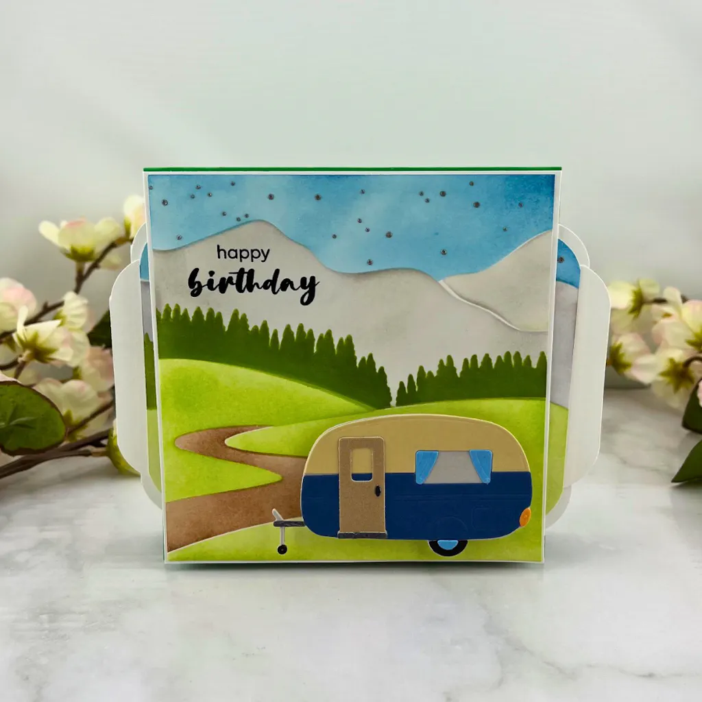 Capture fun and colorful travel scenes on your handmade cards with the Cute Camper Layering Die Set!