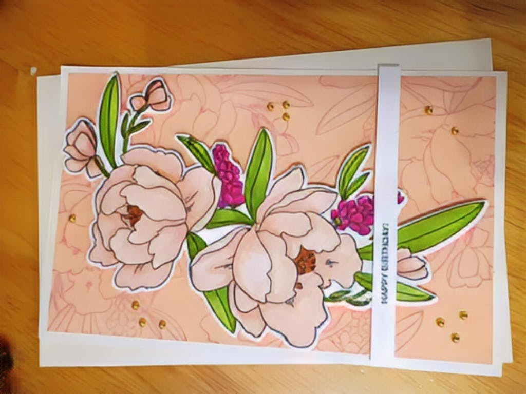 I absolutely love the Peony and Lilac Swag, very easy to color with the stencils, the total length of the swag is 7 1/4" x 3 3/4" not including the white borer... it is HUGE!!!, I just made a card and created a 3D peony by cutting and using darker colors on some of the petals.