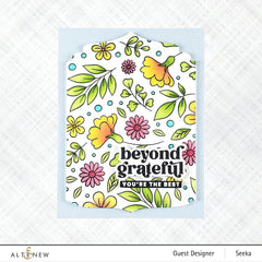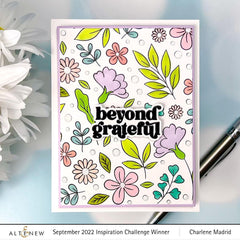 Die Dimensions: Flower Pattern: 5.5" x 5.5" ▪ I miss hearing your laugh: 3.6" x 1.1" ▪ Beyond Grateful: 2.1" x 1.1" ▪ I am here for you: 2.4" x 1.0"