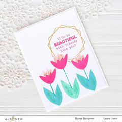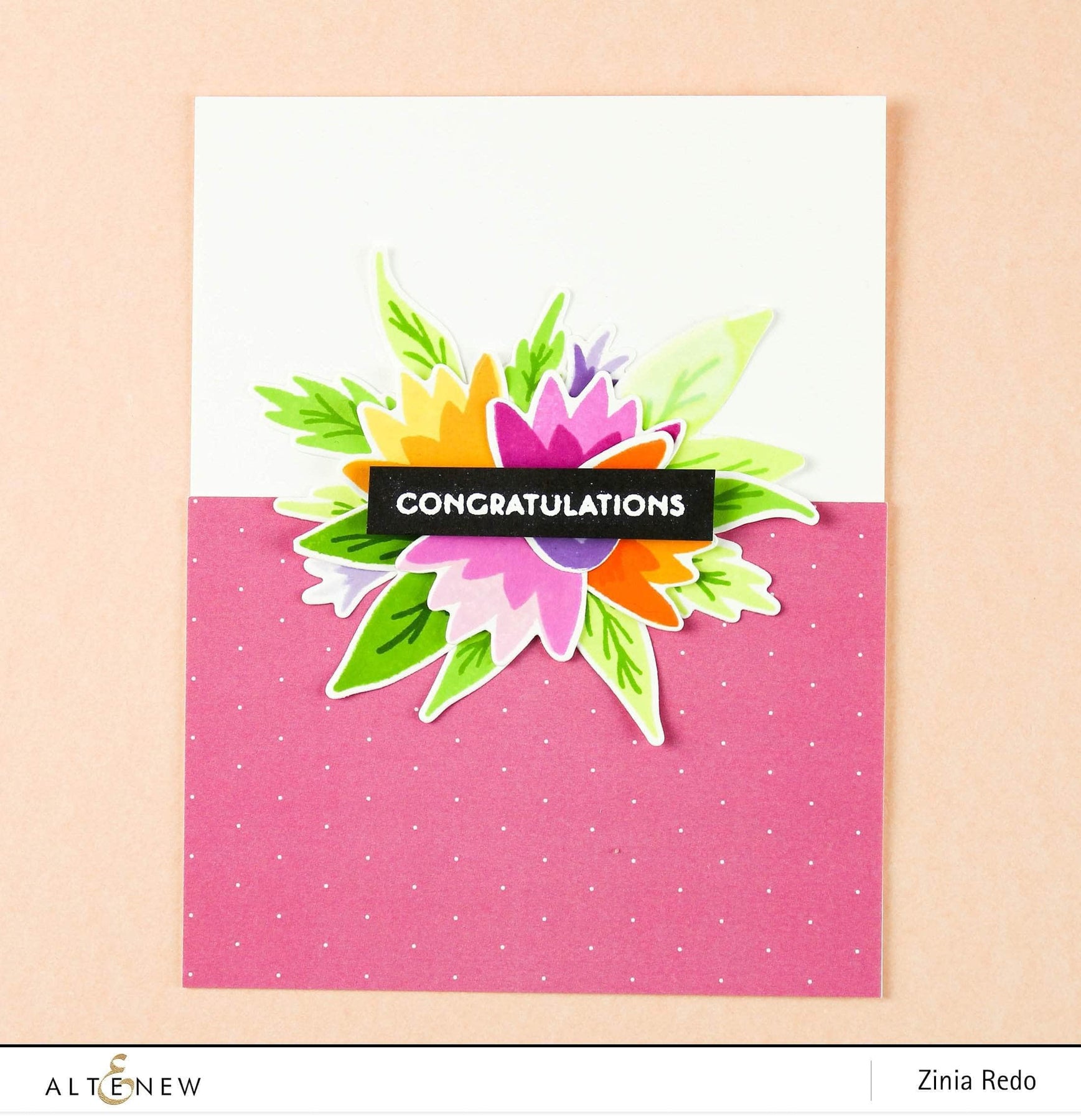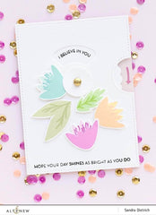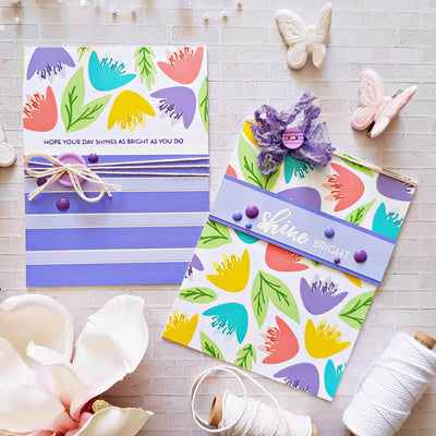 Let your cards shine bright using this fun floral set. These whimsical layered flowers and leaves will look great on a variety of different projects including cards, journals, scrapbook pages, or even home decor.