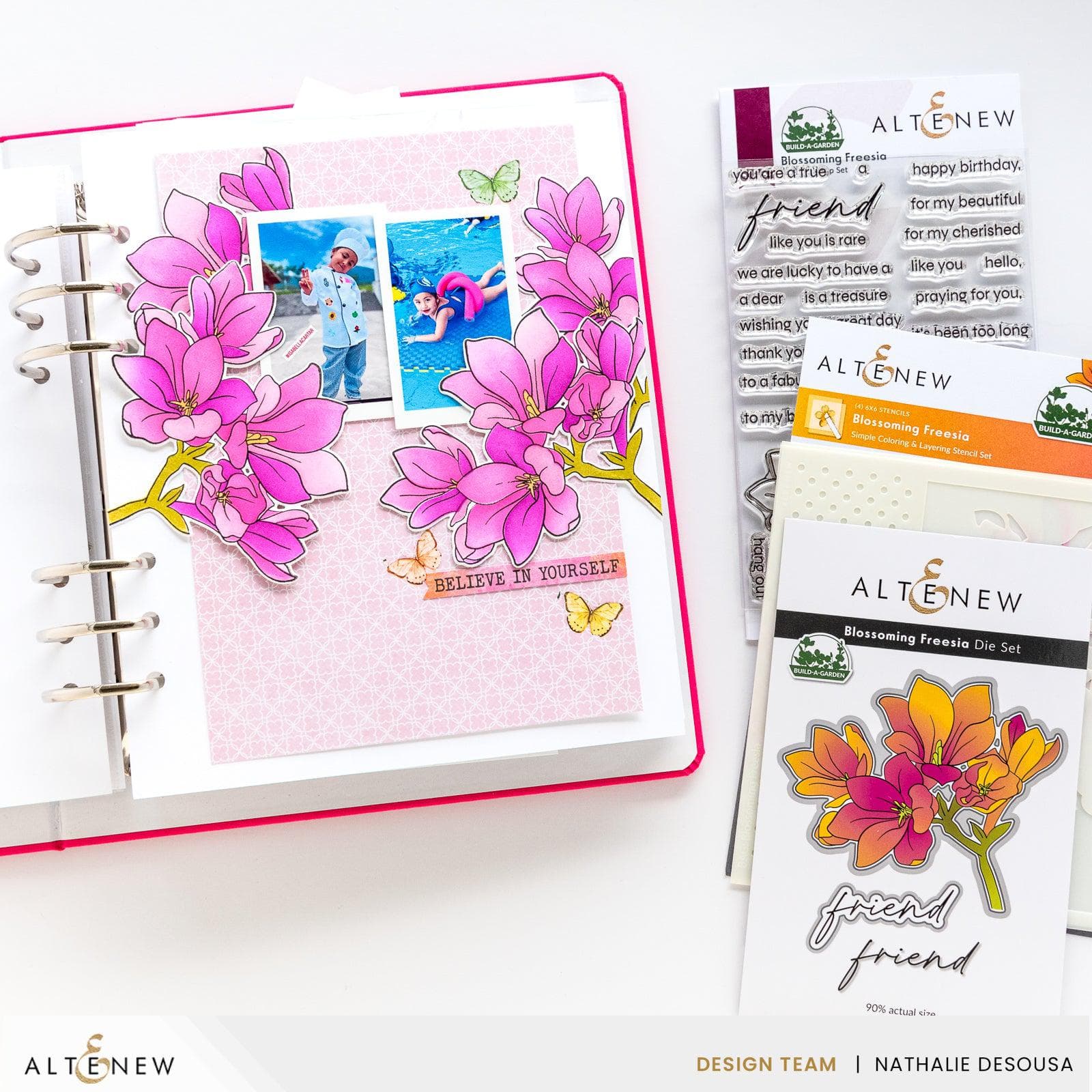 The Build-A-Garden: Blossoming Freesia Layering Stencil Set complement the freesia branch outline stamp, enabling you to effortlessly blend colors and shades onto the image. We have also included a dot design that can be used as a background, and a mask of the branch for inking around it with your favorite colors!