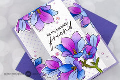 The Build-A-Garden Blossoming Freesia Die Set features 3 designed to effortlessly cut out a 1mm border for the Freesia branch, and two different die styles for the "friend" sentiment (border and shadow).