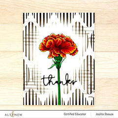 This kit includes a stamp set with an arrangement of an open carnation with two buds, a single carnation, as well as three complementary leaves. The versatile sentiments feature a stunning cursive font along with additional phrases. They are a joy to color with pencils or watercolor, or you can easily bring them to life with the coordinating stencil set.
