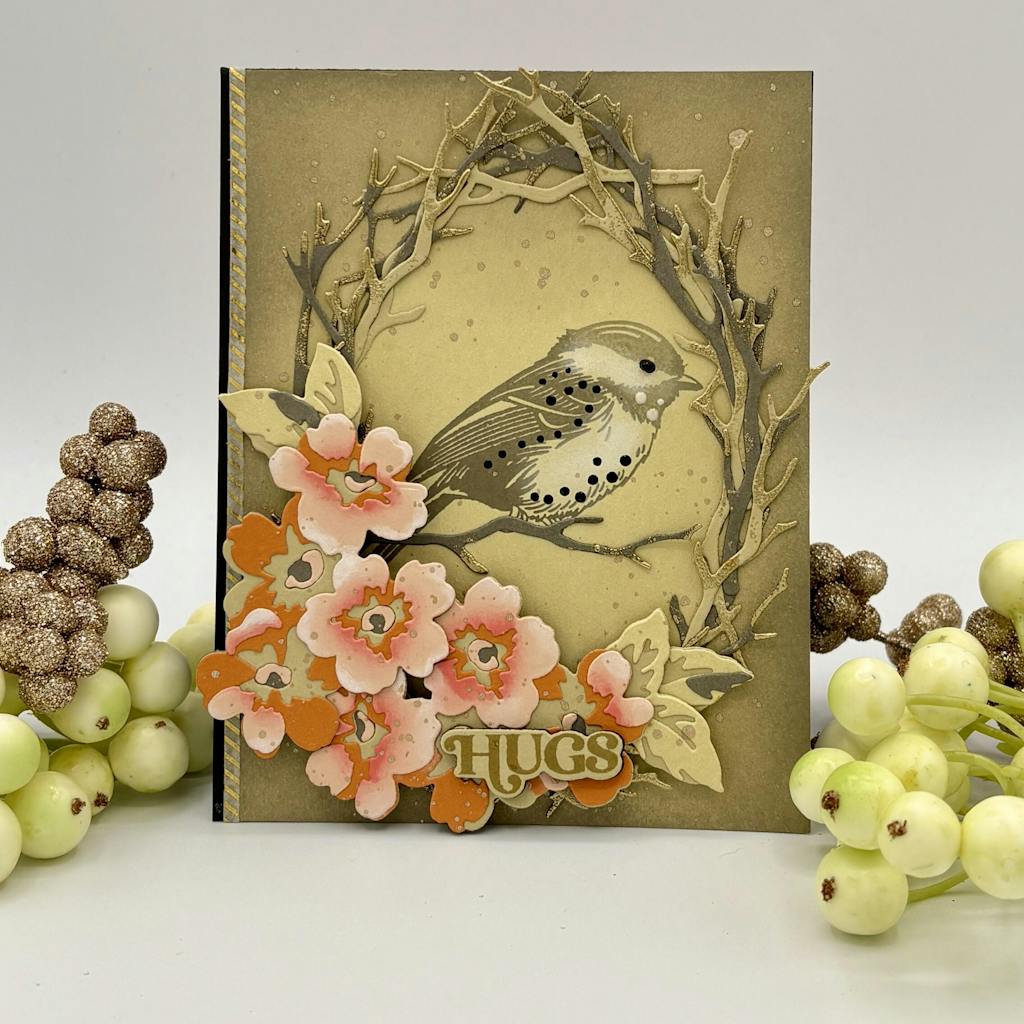 Die Dimensions: Bird with branch: 5.6" x 3.1" ▪ Bird: 2.4" x 2.4" ▪ Sending you warm hugs: 1.3" x 1.4" ▪ with love: 0.7" x 0.5" ▪ a sweet hello: 0.8" x 0.5" ▪ a little holiday magic just for you: 1.7" x 0.6" ▪ thinking of you with love: 1.8" x 1.7"