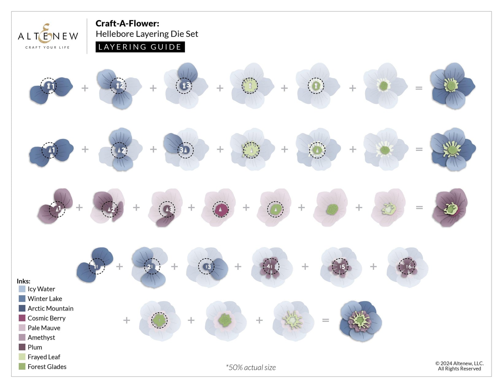 Hellebores are often referred to as "Christmas roses" or "Lenten roses" because they bloom in late winter to early spring, bringing color to gardens when most other plants are still dormant. With this set, you can create four stunning and realistic hellebore flowers, each featuring five large, showy sepals arranged in perfect radial symmetry. The intricate petals form a ring of delicate tubular nectaries, nestled beautifully within the sepals. Tip: Pair this layering die set with our new Crafty Necessities Cardstock Sets for quick and colorful 3D flowers!