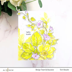 This stamp set features a delicate combination of wild vines and flowers. The wild rose and ivy flowers will fill most of an A2-sized card front and can be stamped at various angles to get different looks. The stamp set also contains one detail coloring layer for each element.