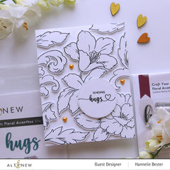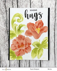 Die Dimensions: Larger Flower: 2.7" x 4.2" ▪ Smaller Flower: 3.6" x 2.4" ▪ Flourishes: 1.8" x 3.2", 1.9" x 2.8" ▪ Leaves: 1.0" x 2.4", 0.8" x 2.2", 1.2" x 1.9" ▪ "hugs" sentiment: 2.0" x 1.4"