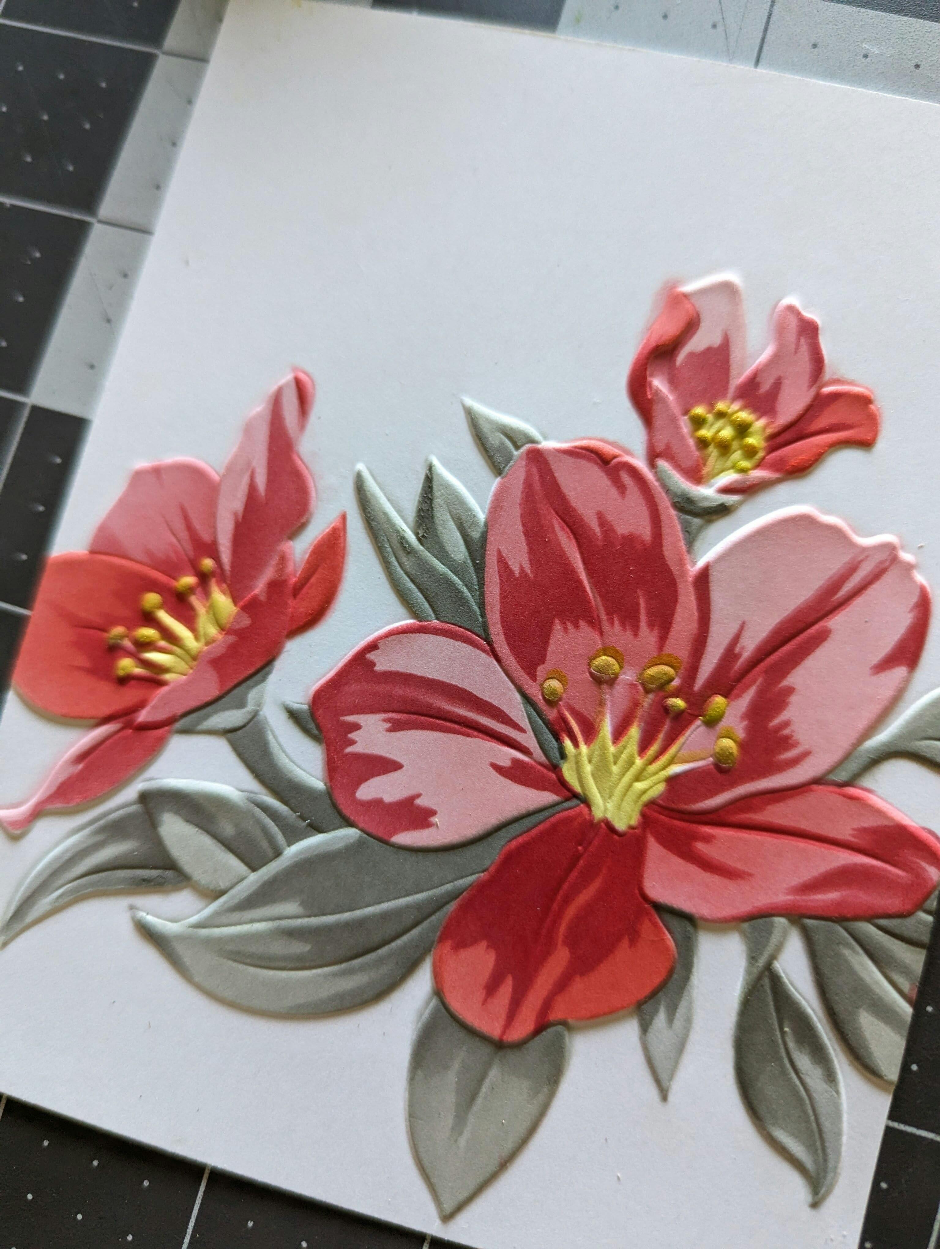 The stencil set includes layers for each petal and leaf, along with a more intricate detail layer. The etched guidelines make it a breeze to line up, whether you use the coordinating stamp set/embossing folder or not!